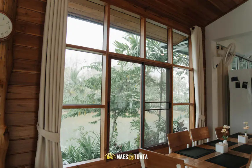 ร้านตั้งอยู่ไม่ไกลจากตัวเมืองแม่สอด เดินทางง่าย จอดรถสะดวก บรรยากาศภายนอกดูเรียบง่ายแต่แอบเก๋ พอเดินเข้าไปจะรู้สึกเหมือนได้หลุดเข้ามาในบ้านสวนหลังใหญ่ที่เต็มไปด้วยต้นไม้ ร่มเงา และแบบธรรมชาติๆ